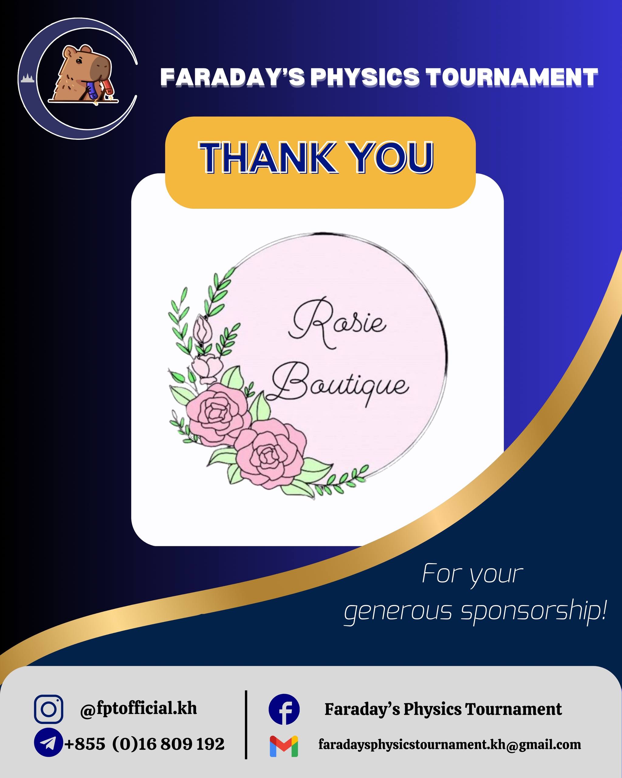 ក្រុមការងារ FPT សូមថ្លែងអំណរគុណយ៉ាងជ្រាលជ្រៅចំពោះ Rosie Boutique🌺ដែលបានចូលរួមជា In-kind Sponsor ក្នុងការកម្មវិធីប្រគល់ពានរង្វាន់ និងមេដាយដែលបានប្រារព្ធឡើងនៅថ្ងៃទី២ ខែសីហា ឆ្នាំ២០២៥ កន្លងទៅនេះ។