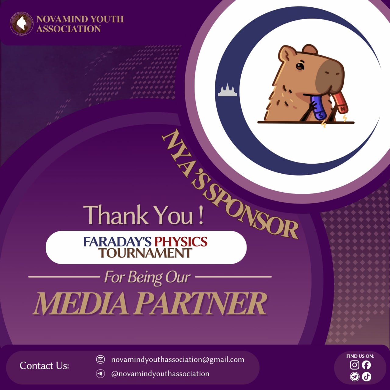 😁 សូមអរគុណទៅកាន់ក្រុមហ៊ុន Faraday’s Physics Tournament ដែលជាគូសហការប្រព័ន្ធផ្សព្វផ្សាយក្នុងកម្មវិធី NYA’s BioChem Challenge! យើងនឹងខិតខំប្រឹងប្រែងធ្វើកិច្ចសហការដ៏រឹងមាំជាមួយគ្នា បង្កើតការយល់ដឹងដ៏មានឥទ្ធិពលនៃកម្មវិធីរបស់យើង និងរីកចម្រើនជាមួយសហគមន៍របស់អ្នក។ 🙌