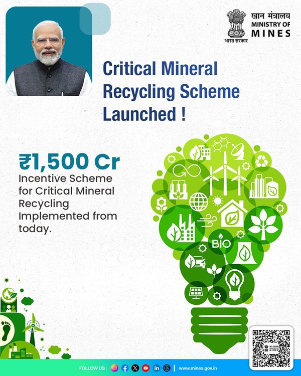 ❖ The Ministry of Mines issued detailed guidelines for the ₹1,500 crore Critical Mineral Recycling Incentive Scheme.