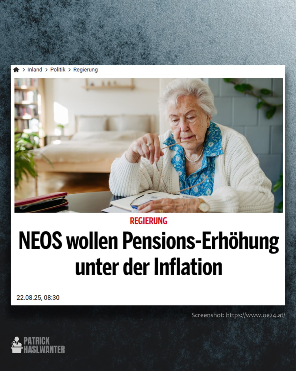 Die NEOS wollen eine Pensionserhöhung unter der Inflation, was nichts anderes bedeutet, dass die Kaufkraft der Pensionisten weiter sinkt!